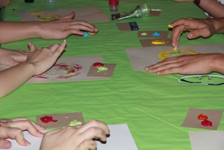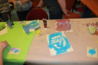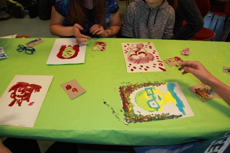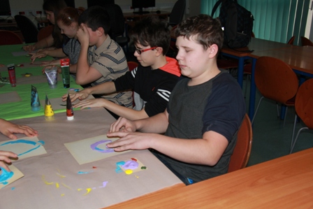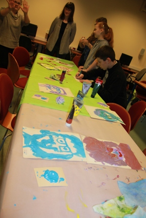 Druga część warsztatów rozpoczęła się wyobrażeniowym spacerem relaksacyjnym. Z zamkniętymi oczami i muzyką relaksacyjną w tle, uczniowie przygotowali się do stworzenia kolejnej książki pt. „Opowieść o mnie”. Najpierw przypomnieli sobie jak wygląda ich twarz, potem dotykając twarzy utrwalali wiedzę o sobie a następnie nadal mając zamknięte oczy malowali swój obraz farbami na papierze.