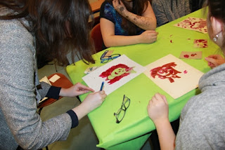 Efekty- po otwarciu oczu - były niesamowite i wzbudziły wiele emocji zwłaszcza śmiechu. Uczniowie dokończyli portrety już z otwartymi oczami i nadali nazwy swoim dziełom. Najlepiej oddają to załączone zdjęcia.